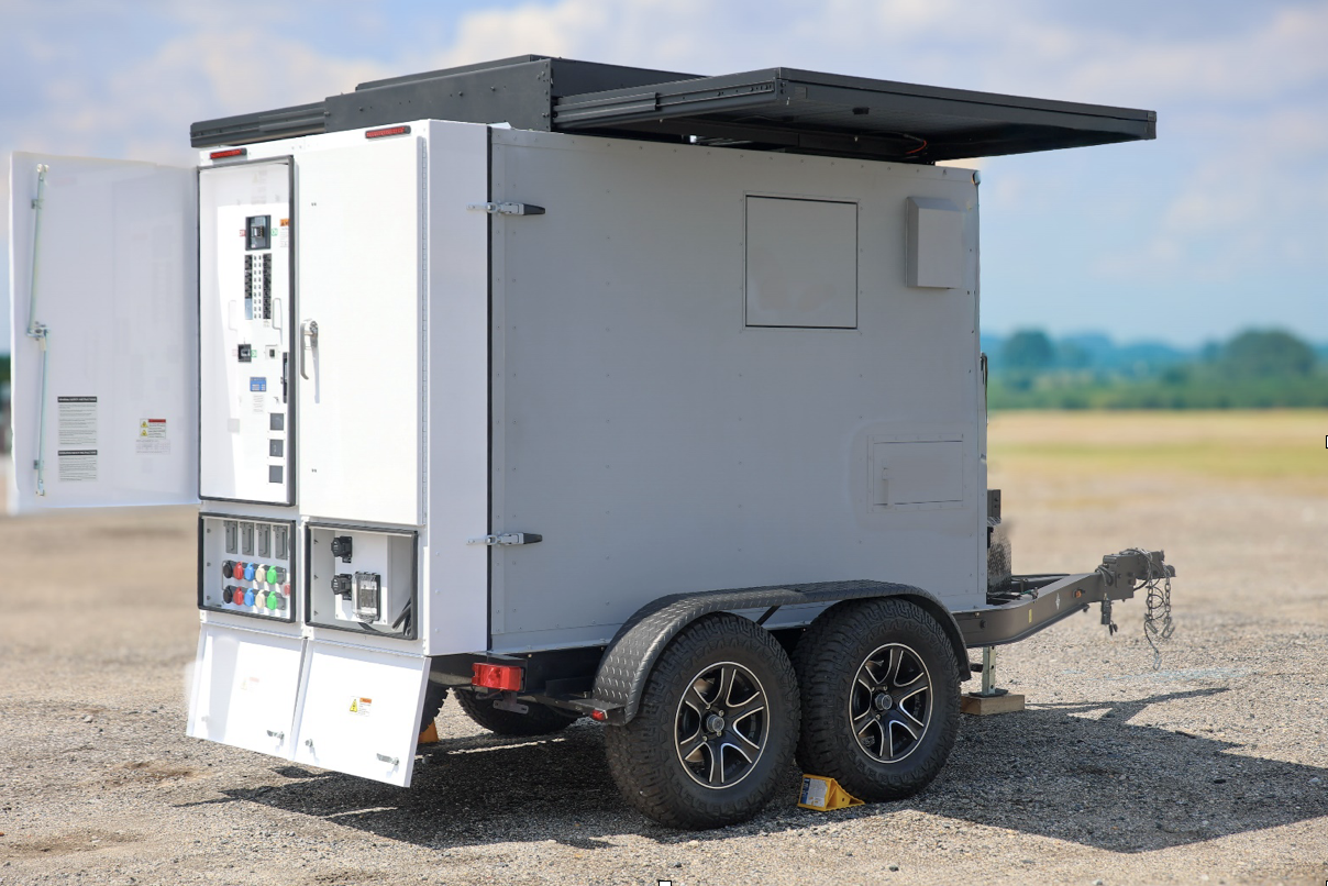 The Green Grid 90 kWh mobile battery energy storage system (MBESS) generates energy from solar panels on its roof and stores it in a lithium-ion battery. The units, which also can be plugged in to charge, are emissions-free and don’t require fuel or make noise. They can also be daisy-chained together for larger power demands.